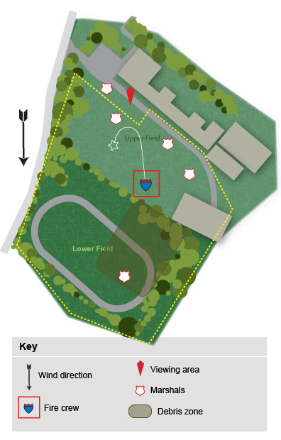 Lance work, Catherine wheels and fire rope are used at ground level.